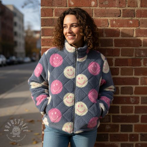 Mantelstoff TEDDY JACQUARD Happy faces jeans